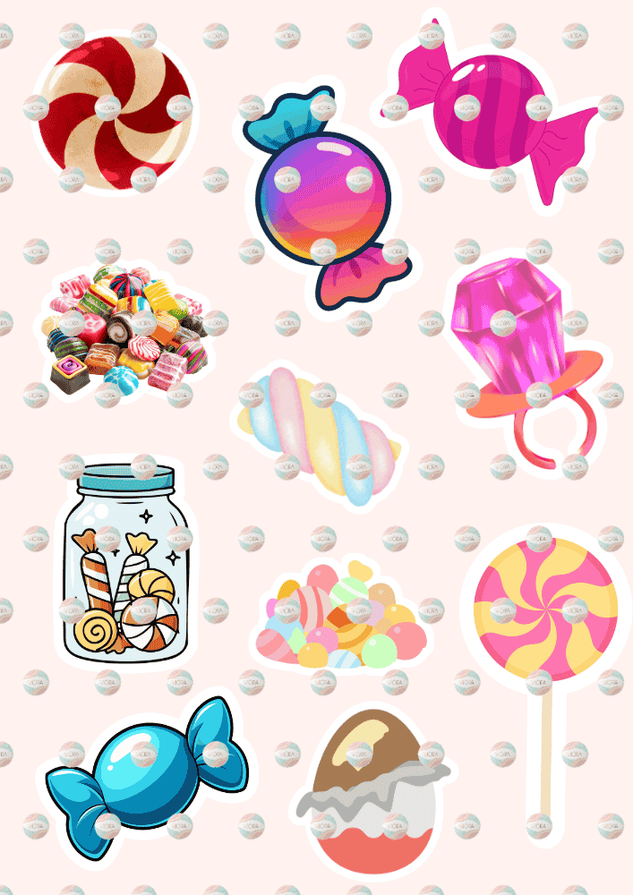 A fun collection of treats like candies, lollipops, gummies, chocolate pieces, and sweet snacks.